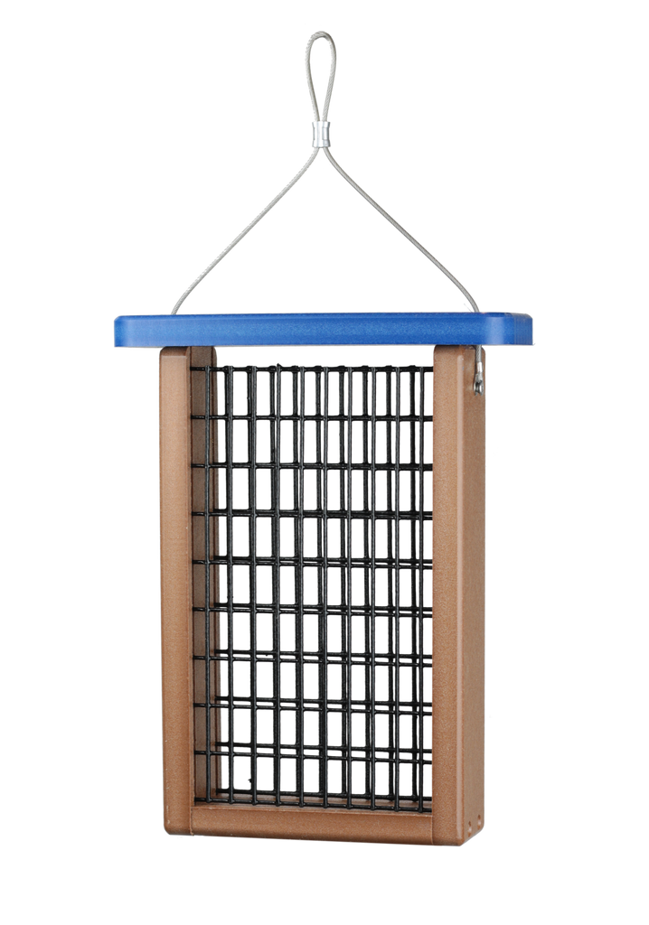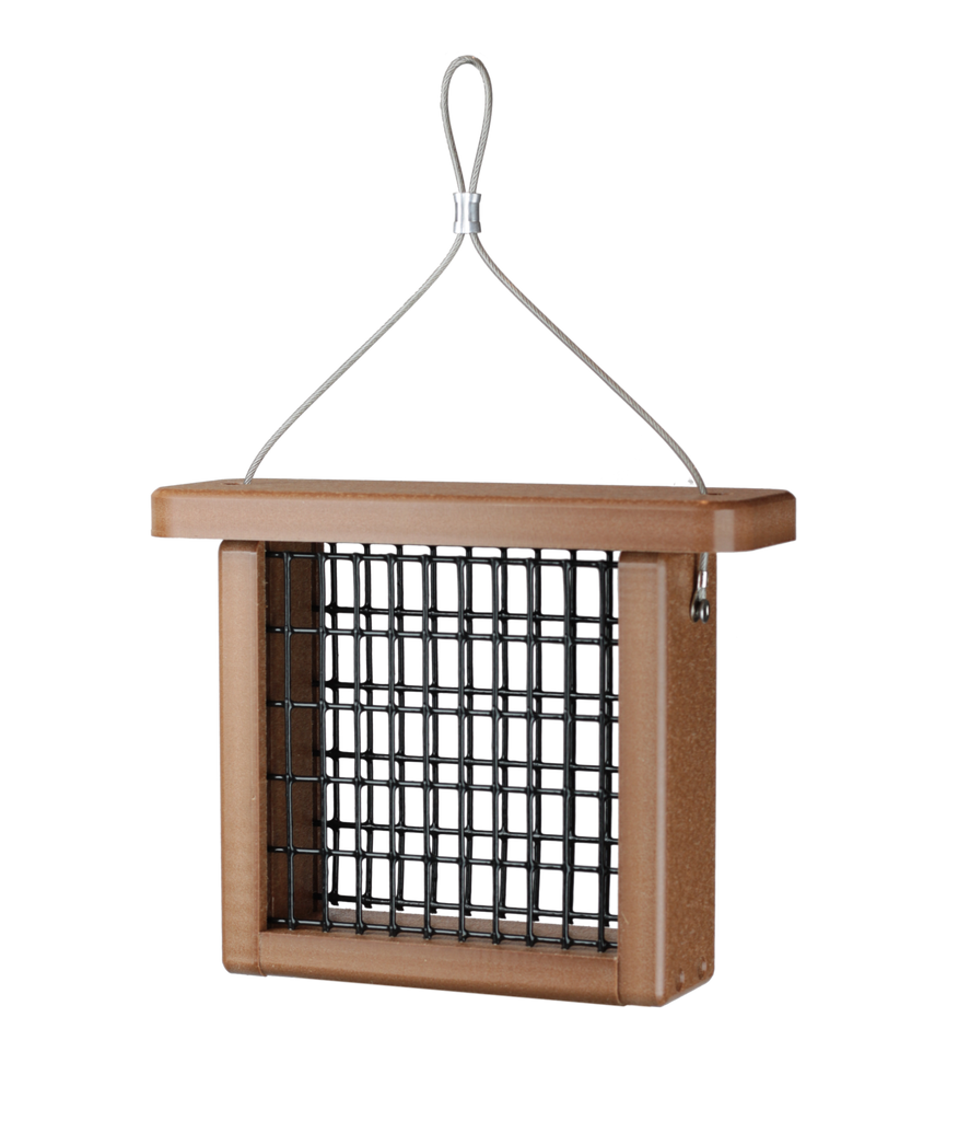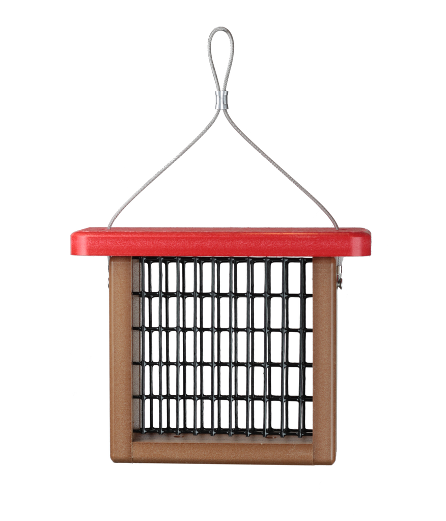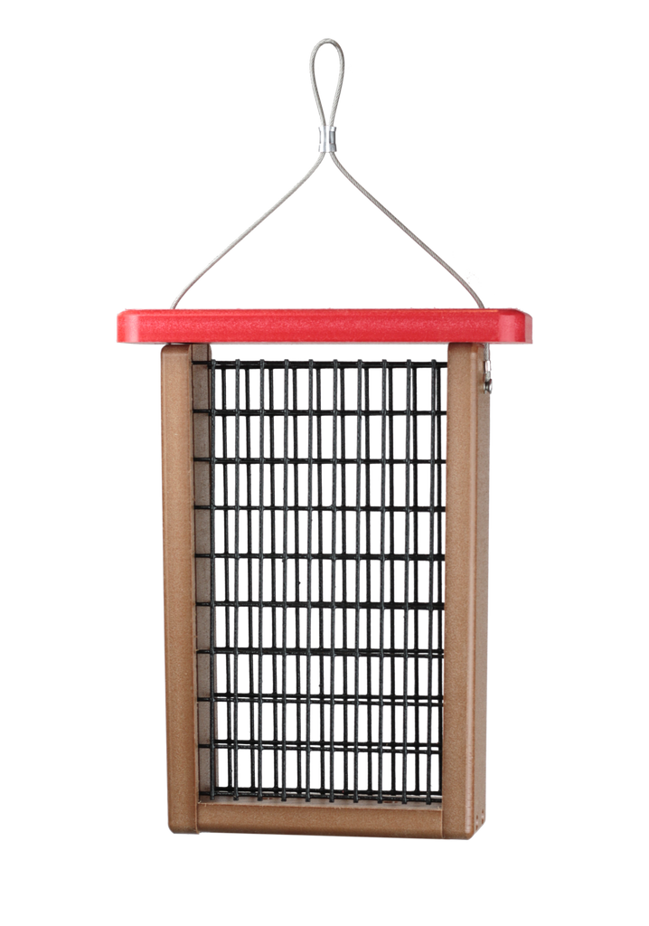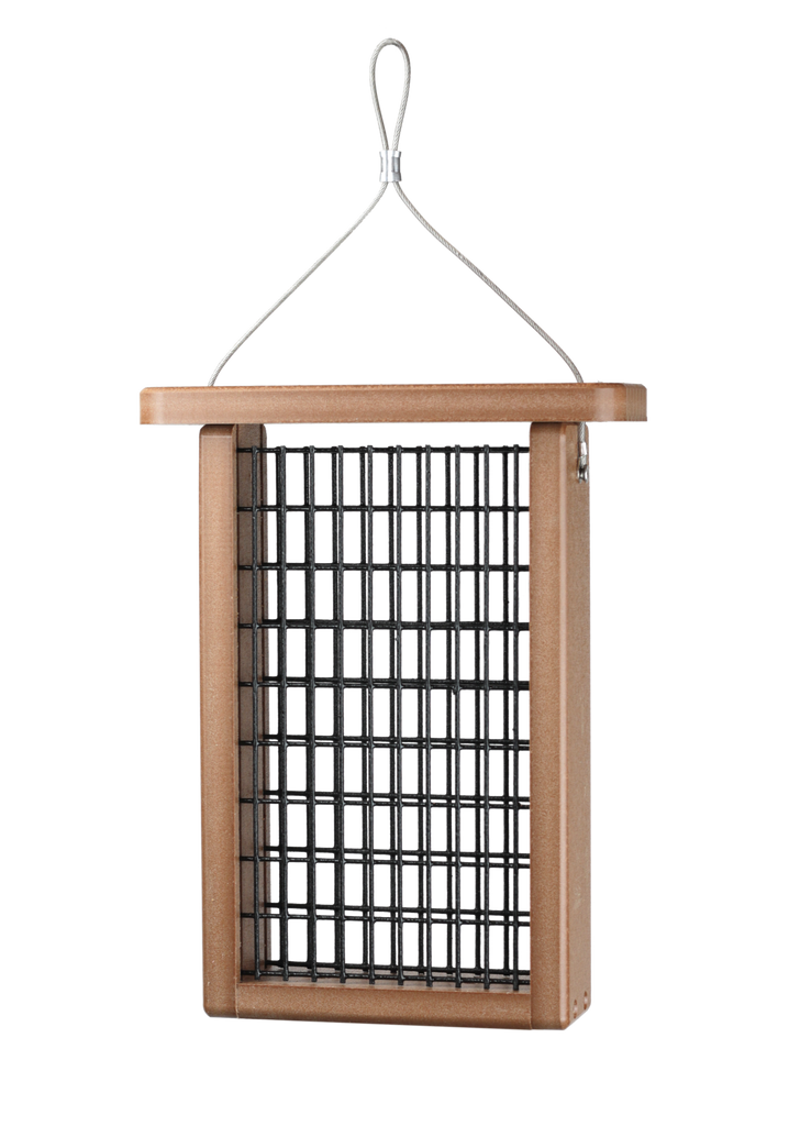 Very simple design! Drop in one suet cake and you’re done. Wild birds, especially woodpeckers, nuthatches, and chickadees are able to cling to the wire mesh for feeding.