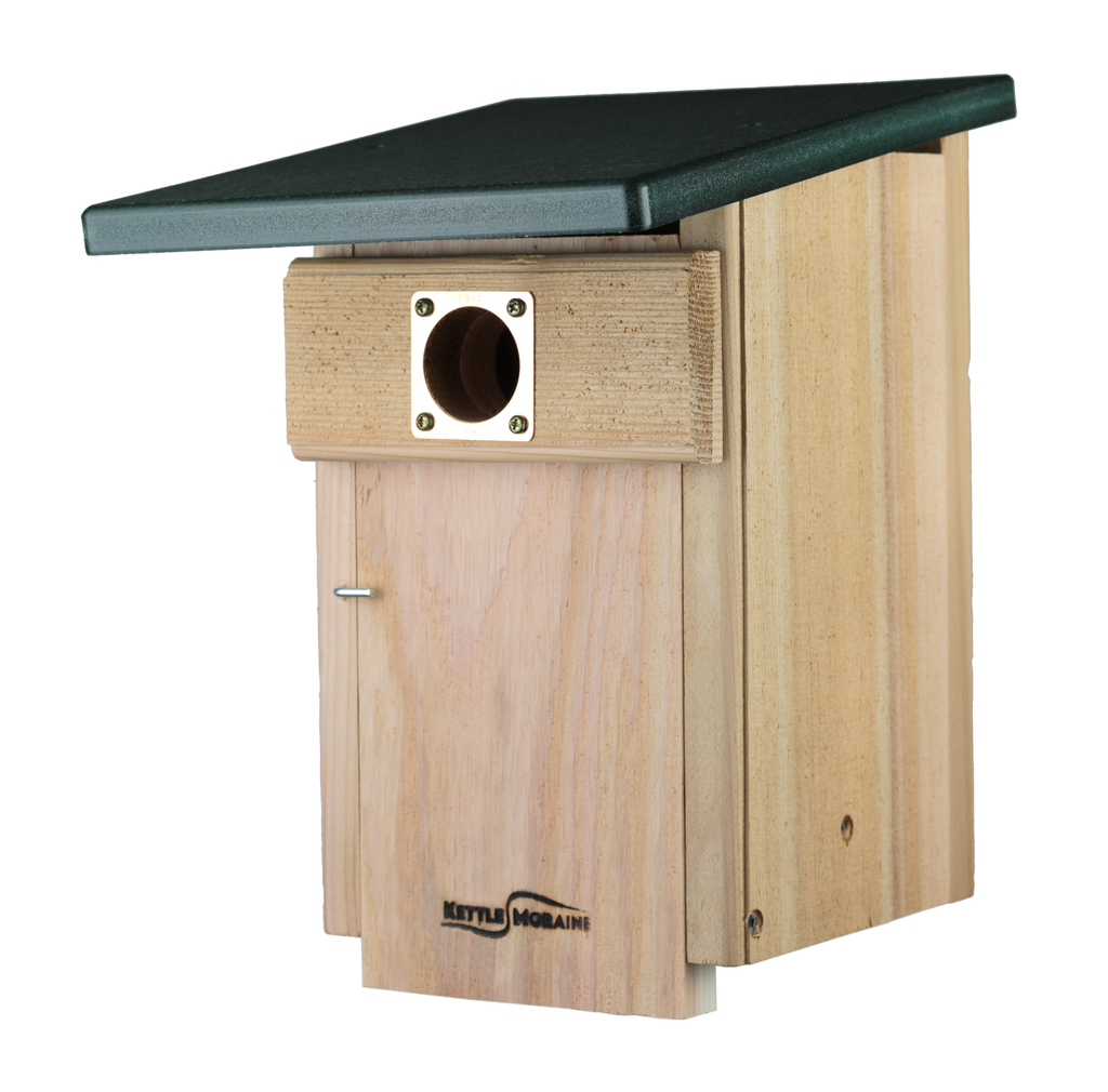 A good bluebird box should be more than just a cavity for a bird to build a nest in. It should be easy to monitor, easy to clean, and provide a safe nesting site. This one has it all. It is very easy to monitor and clean with a flip-down front panel. The fledgling ladder below the exit gives the bluebirds additional traction. There is plenty of ventilation just under the roof line and drainage holes on the bottom to keep the nest dry. It is a very well-made box! An information sheet is included with the nest box.